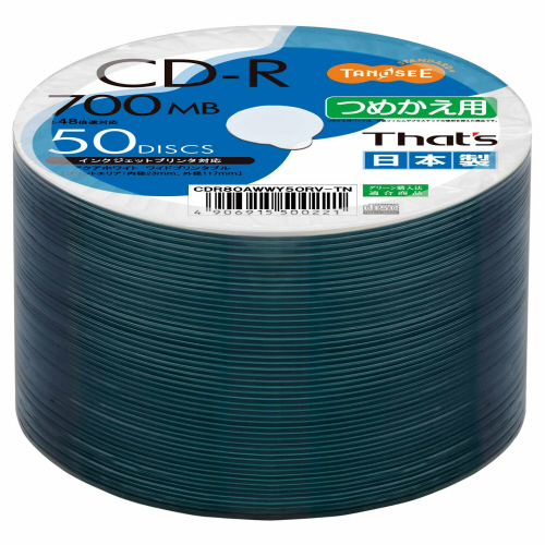 TANOSEE Thats データ用CD−R 700MB 2−48倍速 アクアホワイトワイドプリンタブル 詰替用 1個(50枚)